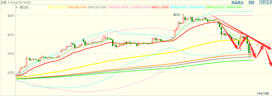 从1小时图表来观察,白银TD跌幅较黄金TD更大,短期下降趋势更加明显,日内关注反弹后碰触趋势线阻力,可适当开空。白银压力:18.5(4500),支撑:17.7(4350)。
