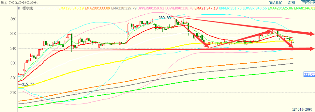 上周,主要受美元强势攀升影响,周五国际黄金价格大幅下挫,单周跌幅达到近20美元。隔夜黄金TD收盘报345.06,白银TD报4285。