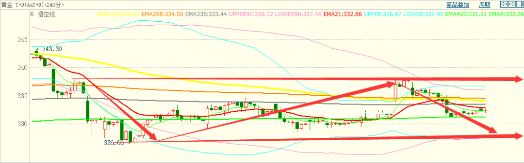 从4小时图表观察来看,黄金TD昨日冲高再次回落,暗示上方压力较大,加之整体走势处于空头,金价恐仍有向下寻找支撑可能性。黄金压力:1470(333.5),支撑:1450(329.5)。