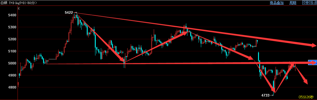 从1小时图表观察来看,白银TD跌破三角形下轨后,快速下杀一波,但随后发生暴力反弹,重返跌破价位区域。我们需关注近期此区域压力,若连续三个交易日位于5000下方,银价将有望再次下跌。白银压力:24(5060),支撑:23.00(4860)。