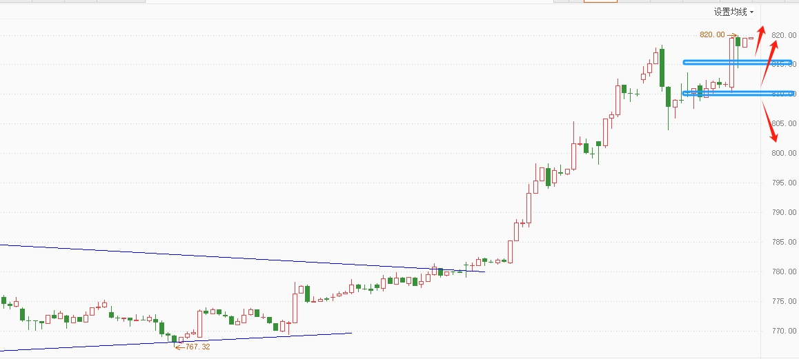 国际黄金日线收带上下影实体中阳线,并刷新历史高点,各周期上涨结构完好,短期多空分界点移至 3560(812)继续看涨。黄金压力:3600,3630(824,826),支撑:3575,3560(814.50,812)。