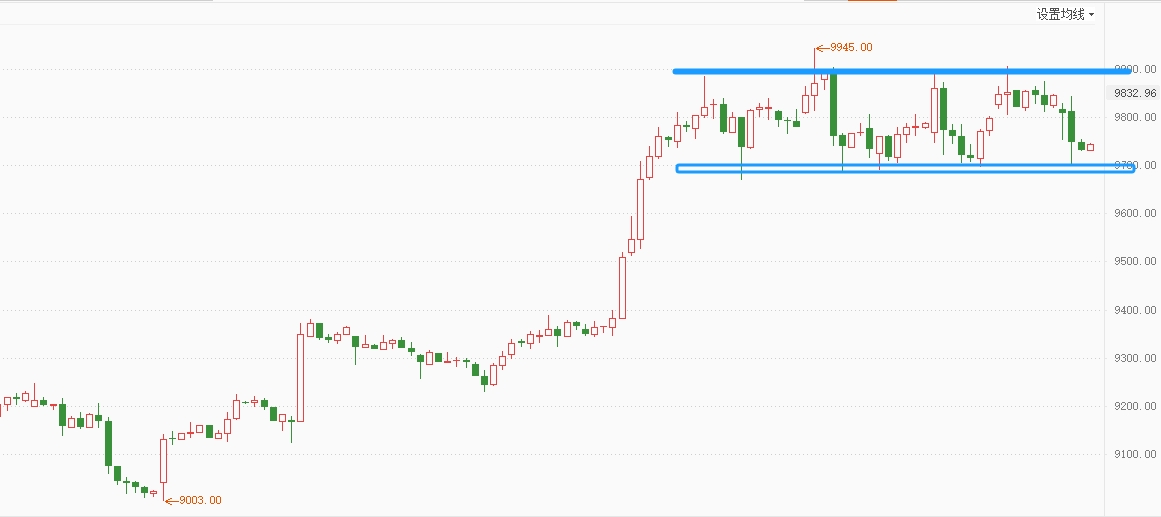 白银TD维持高位区间整理,震荡时间过长,警惕见顶,继续关注区间突破,激进的继续区间内高抛低吸,破位止损。白银压力: 41.30,41.50(9815,9900),支撑:40.60,39.00(9660)。