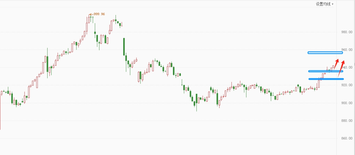 国际黄金日线收光头光脚大阳线,一举突破前期小区间,日线形成新的上涨结构,短线仍有上行动力,短期多空分界点移至4000(926)继续看涨。黄金压力:4160,4190(950,957),支撑:4095,4050(936,926)。