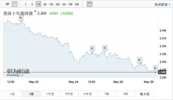 截至第一财经记者29日早间截稿时,10年期美债收益率进一步跌至2.268%,再创新低;10年期德债收益率跌至至-0.161%,创近3年新低。