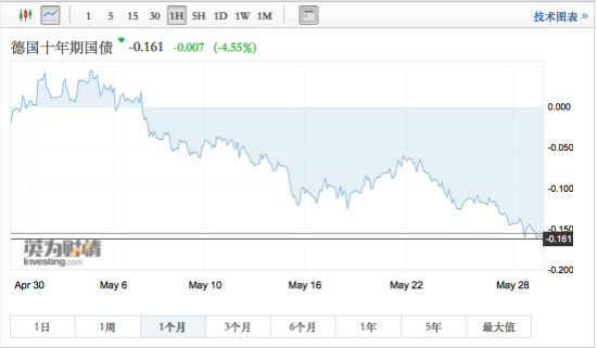 欧债情况相同。德国10年期基准国债收益率下跌3.4个基点,报-0.12%,与2016年9月30日以来的最低位-0.132%相差无几。