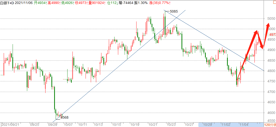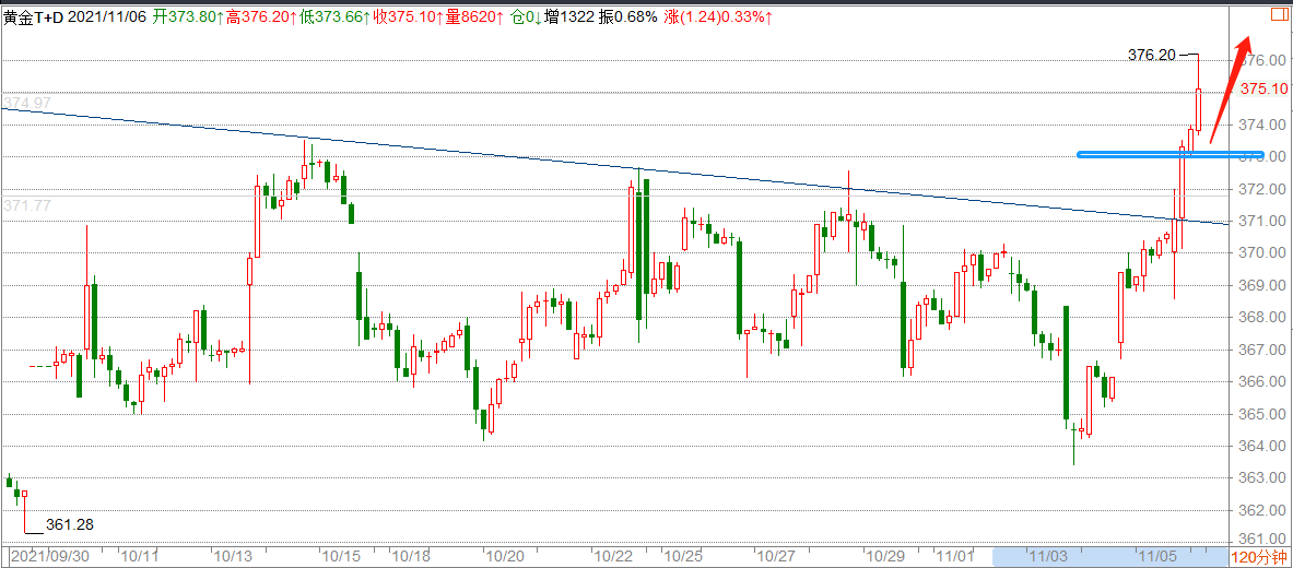 上周五(11月5日)美国非农数据大幅好于预期,美国众议院通过5500亿美元基础设施法案。市场风险情绪高涨,美三大股指再创历史新高,美债收益率直线下跌,黄金大幅飙涨,金价站上1810(375)关口。周一黄金TD开盘报374.45,白银TD报4936。