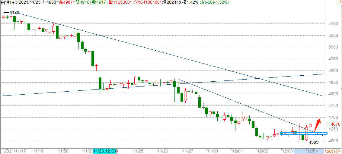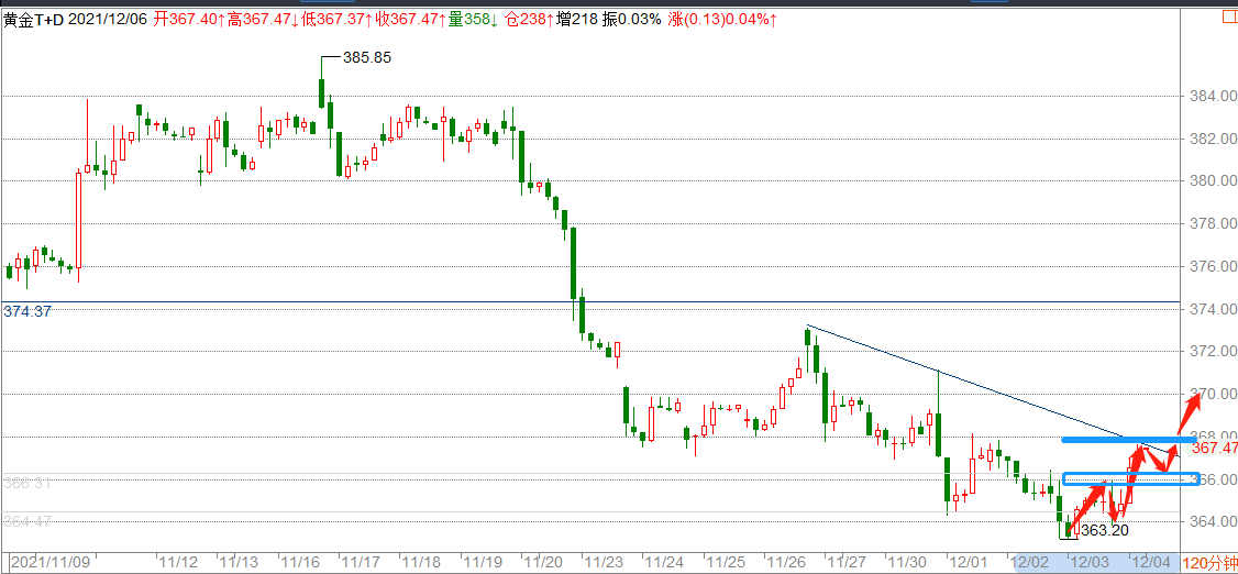上周五(12月03日)美国非农数据大幅低于预期,叠加奥密克戎在全球快速传播,市场避险情绪激增,美三大股指全线收跌,避险资产美元、日元、瑞士法郎、黄金齐齐上涨。周一黄金TD开盘报366.71,白银TD报4674。