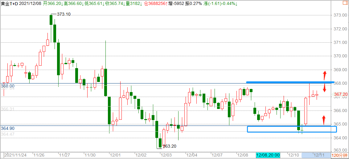 上周五(12月10日)美国通胀创近40年来新高;美国消费者信心指数自10年低点反弹。美元小幅下滑,金价自低位反弹。周一黄金TD开盘报367.22,白银TD报4615。
