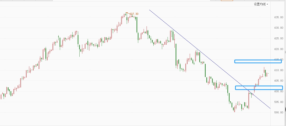 国际黄金日线收小阳线,日线2连阳,涨势趋缓,分时保持上涨结构,由于反弹力度足够,短期仍有可能反复冲高,反弹空间有限,不建议追高,等待反弹后的做空信号。黄金压力:2640-50(613-15),支撑:2610-00(602-00)。