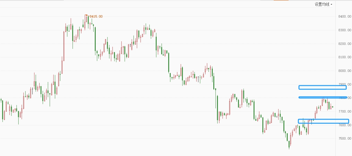白银TD在7800受阻,小幅回落,但分时上涨结构保持完好,整体仍处于反弹当中,不建议追涨,耐心等待反弹后的做空信号。白银压力:31.60(7820,7860),支撑:30.70(7650,7610)。