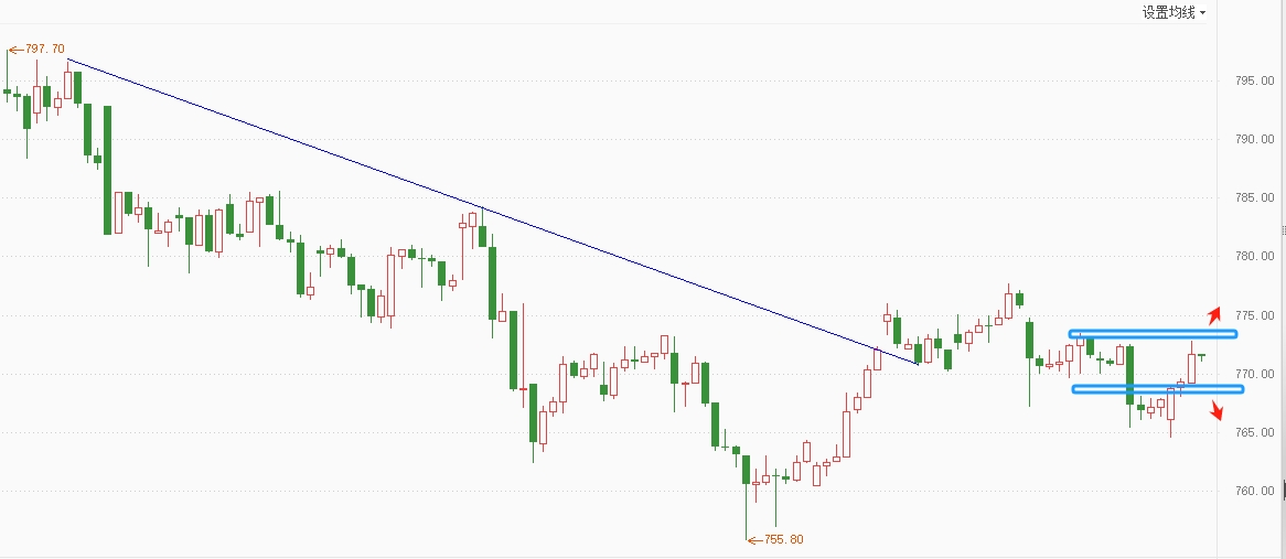 国际黄金日线收带较长下影十字,分时形成新的上涨结构,维持3370-3300(774-765)区间波动,短线预计仍是震荡,关注3350(373)一线压力及分时结构的转换。黄金压力:3350(773-74),支撑:3320,3310(768,765)。
