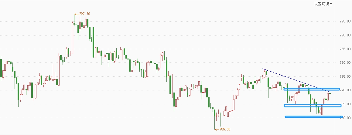 国际黄金日线收带下影小阳线,分时形成新的上涨结构,呈现宽幅震荡偏下走势,关注日线下跌趋势线压力,整体仍是震荡,继续以3340(771)为短期多空分界点择机做空。黄金压力: 3340(770-71),支撑:3300,3270(765,764)。