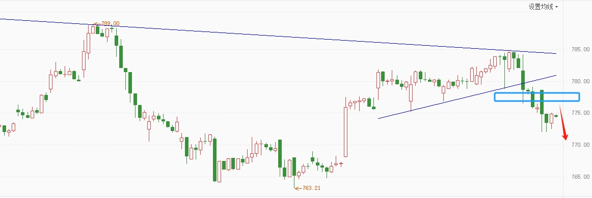 国际黄金日线收实体大阴线,之前的上涨宣告结束,有望回归大区间底部区域,可积极做空。黄金压力: 3365,3380(776.50,778.50),支撑:3300-3280(770,767)。