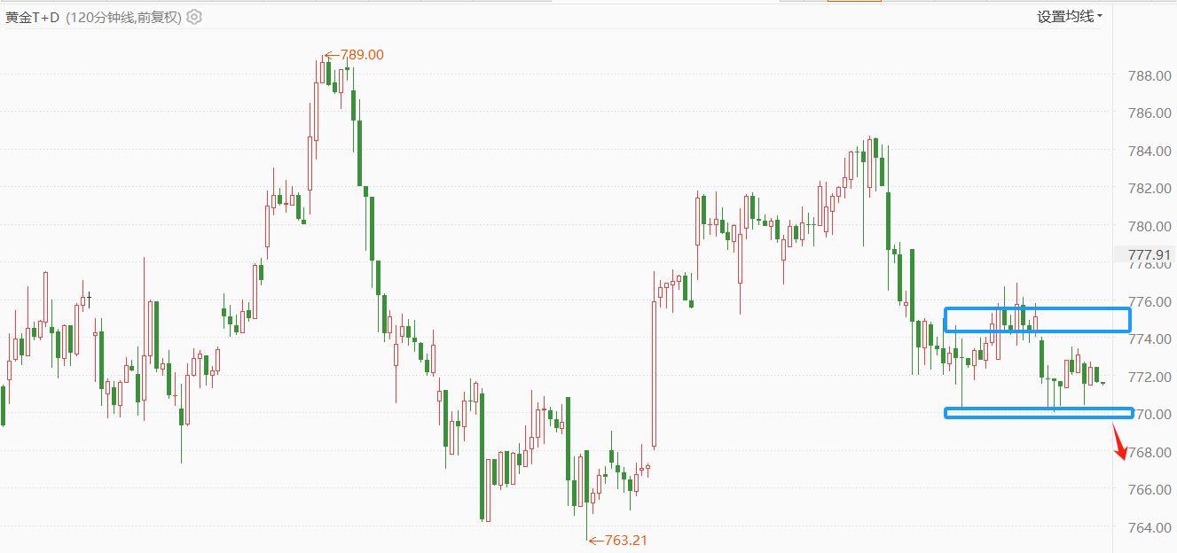 国际黄金日线收带长上影十字,分时保持下跌结构,跌势明显,短期多空分界点移至3360(775)一线,继续看跌。黄金压力:3360(774,775),支撑:3315,3280(770,764)。