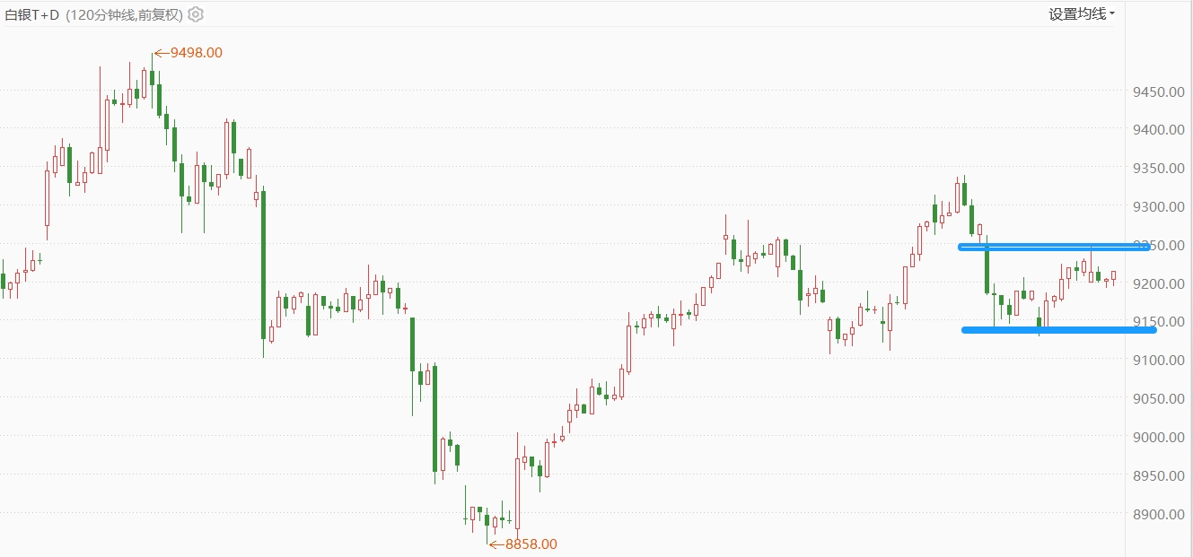 白银TD延续反弹,但幅度有限,继续关注9100一线支撑,下破将打开下行空间。白银压力:38.20(9250),支撑:37.70(9100)。