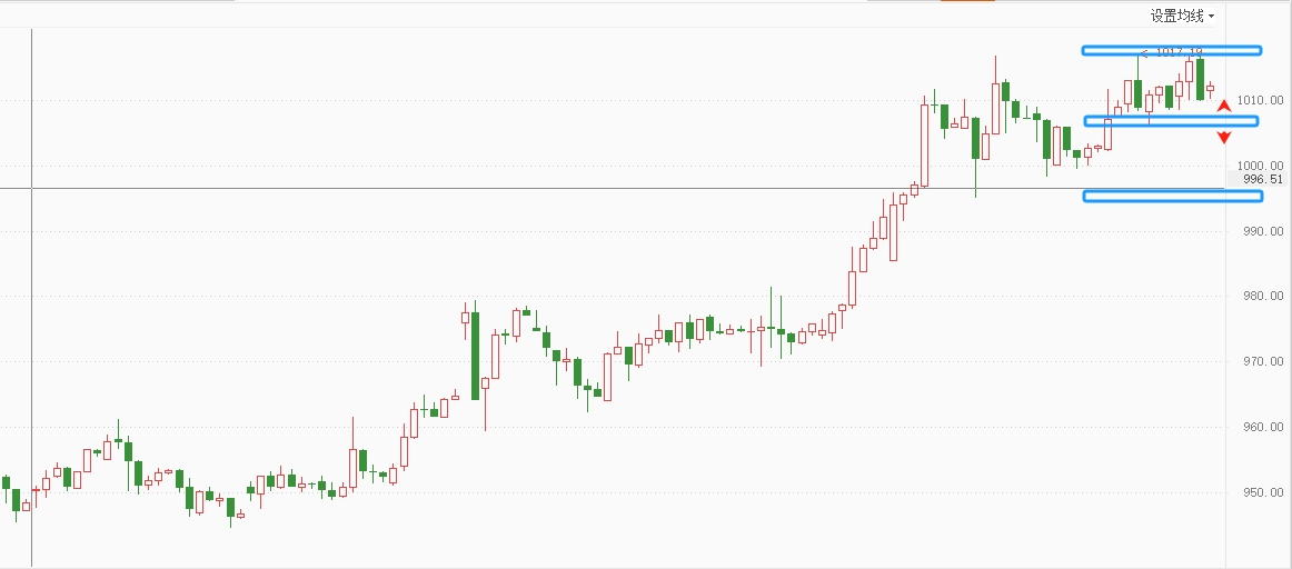 国际黄金日线收实体中阳线,各周期上涨结构完好,维持震荡上行态势,短期多空分界点移至4450(1000)一线谨慎看涨。黄金压力:4550(1018, 1030),支撑:4450(1000,995)。