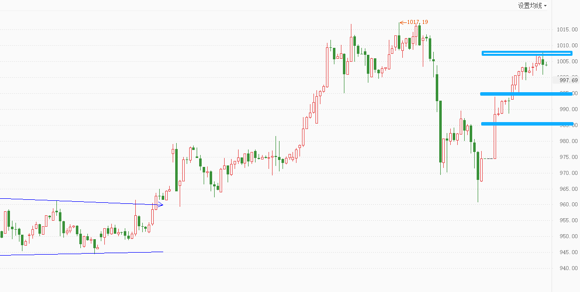 国际黄金日线收实体小阳线,涨幅有所缩小,日线3连阳,上升势头强烈,但临近历史高点,不建议追高,短期多空分界点移至4430(995)谨慎看涨。黄金压力:4500-30(1008),支撑:4430(995,985)。