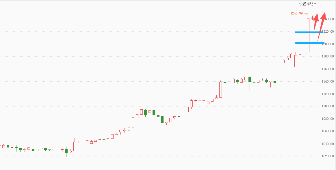 国际黄金日线再收光头光脚大阳线,继续加速上扬,连续大幅快速飙升,恐接近本轮上涨尾声,警惕随时可能出现的大幅调整,不建议追高。黄金压力:5670-5700(1290,1298),支撑:5445(1228,1220)。