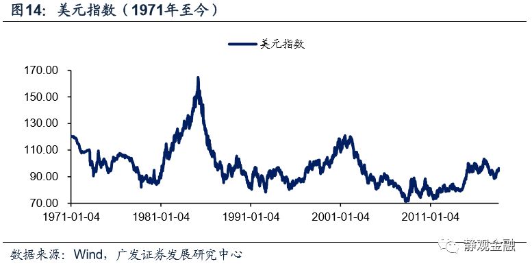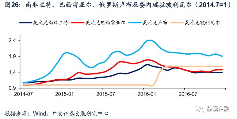 2011年美元迎来了1971年后的第三轮升值周期,但其快速走高则是在2014年7月后。2014年7月后南非兰特、巴西雷亚尔、俄罗斯卢布及委内瑞拉玻利瓦尔等资源型新兴经济体货币最大贬值幅度分别达到:63.9%、79.1%、139.1%及58.7%。