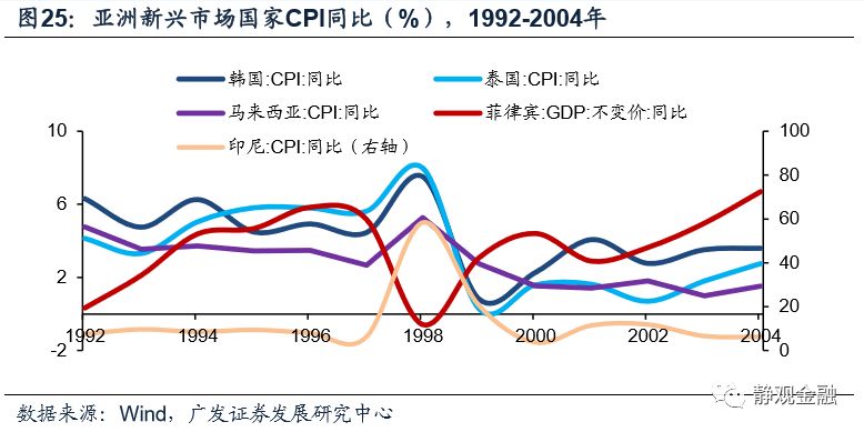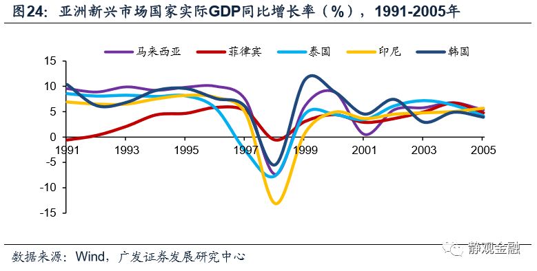 再以马来西亚为例,1996年汇率贬值导致马来西亚对外负债规模(美元计价)相对GDP(林吉特计价)比重被显著放大;FDI存量(美元计价)占GDP(林吉特计价)比重大幅走高,1998年该指标曾超过60%。此外,1998年印尼、泰国、菲律宾、马来西亚、韩国等国实际GDP增速分别为-13.1%、-7.6%、-0.6%、-7.4%和-5.5%,香港、老挝等国家和地区也受到波及。