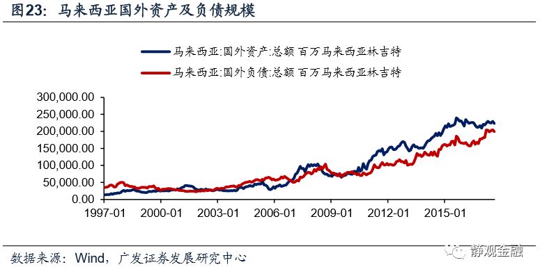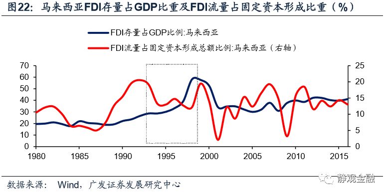 与80年代的拉丁危机的背景类似,进入90年代,发展中国家争夺外资的竞争愈演愈烈。以马来西亚为例。亚洲金融危机爆发前,马来西亚FDI存量占GDP比重已经高达33%,且国外资产规模远低于国外负债(净负债约占GDP比重80%),这表明一旦马来西亚汇率发生波动将对国家资产负债表结构产生较大冲击。1994年美联储启动加息周期,初期美元指数仍处于贬值状态,林吉特仍在升值,FDI仍净流入马来西亚。