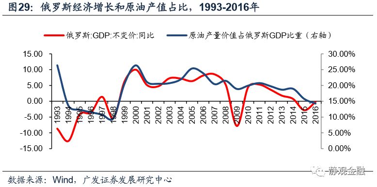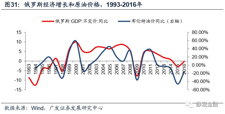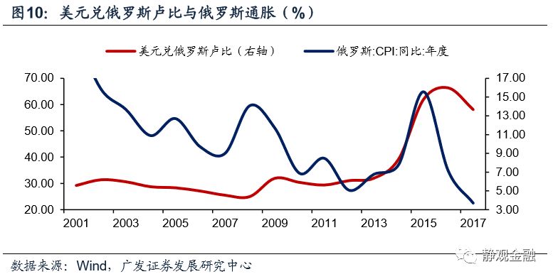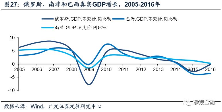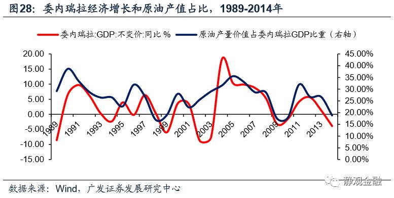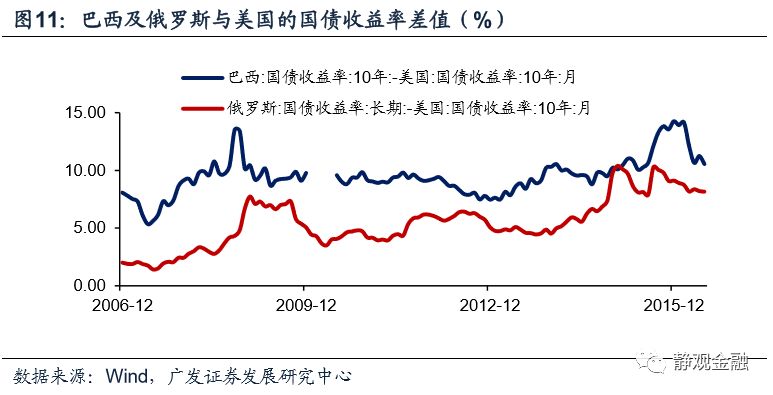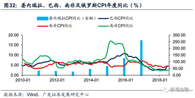 由于原油是委内瑞拉和俄罗斯的主要经济来源,因此不仅油价萎靡对上述两国、尤其是委内瑞拉形成了经济冲击,同时美元升值又压迫了其本币,形成了“油价下行->经济疲软,外汇储备受损->汇率(大幅)贬值->恶性输入型通胀+国别信用风险增加->股债汇三杀”的局面。当然,在全球经济下行风险加剧的过程中,巴西和南非等资源型国家也受到了显著冲击。