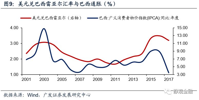 对于资源型新兴市场而言。资源型EM国家包括巴西、南非、俄罗斯等。在美元计价货币体系下,天然的跷跷板关系将导致资源品内在隐含的美元价值下降,削弱资源国的全球竞争力,推动资源国汇率贬值。本币大幅贬值必然带来输入型通胀,因此强美元环境下,资源型国家往往出现高通胀甚至恶性通胀,经济处于滞胀期。企业盈利能力趋弱、国内融资成本却大幅攀升。弱美元周期则逻辑相反:资源品内在隐含的美元价值回升、资源国的全球竞争力增强带来企业盈利改善,汇率升值降低输入型通胀风险,内部融资成本相对回落。