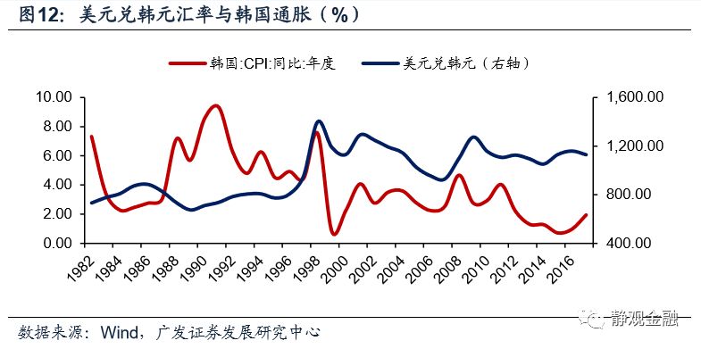 1996-2001年,美元迎来了1971年后的第二轮升值周期。同期韩元、马来西亚林吉特、泰铢、印度卢比等亚洲新兴市场货币最大贬值幅度分别达到:152.6%、86.1%、122.7%及39.4%。此间爆发了亚洲金融危机。