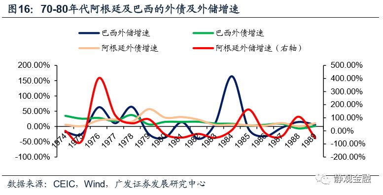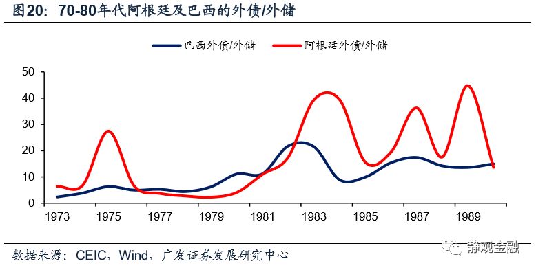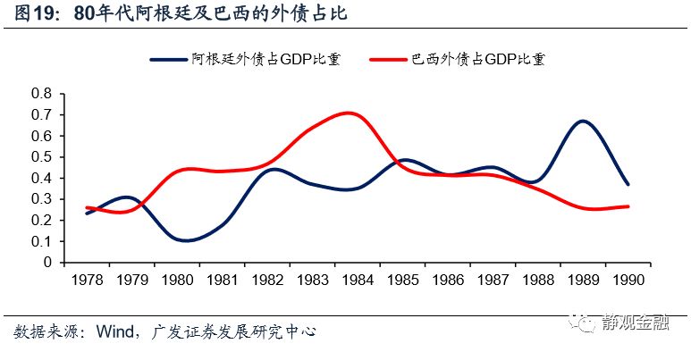 上世纪70年代全球发生了二战后的第二次产业转移,且美日德等部分主要经济体出现消费升级带动全球需求上升。在外部环境的提振下,拉美经济快速发展,吸引大量外资;美元贬值、拉美国家本币升值的环境推动拉美经济和外部资金流入形成了正循环。1981年美元进入升值周期,汇率跷跷板关系令拉美各国相对资本回报率下降,并逐步陷入了“汇率贬值->外资净流入增速下滑->经济增长下滑->杠杆率上升”的负反馈循环。这一过程中拉美国别信用风险上升,并加速了汇率贬值、加剧了经济滞胀。