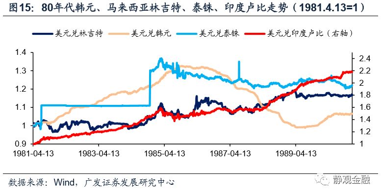 1971年8月15日,美元与黄金脱钩后的第一轮上升周期出现在1981-1985年(以《广场协议》终结)。同期韩元、马来西亚林吉特、泰铢、印度卢比等新兴市场货币均出现大幅贬值,1981年4月13日至1985年3月8日期间各自贬值幅度分别达到:25.8%、12.2%、36.8%及58.2%。这一阶段拉美爆发经济及金融危机(拉美各国汇率指标暂无当时的历史数据,因此以其他EM汇率作为参考系)。