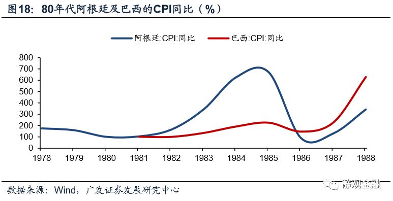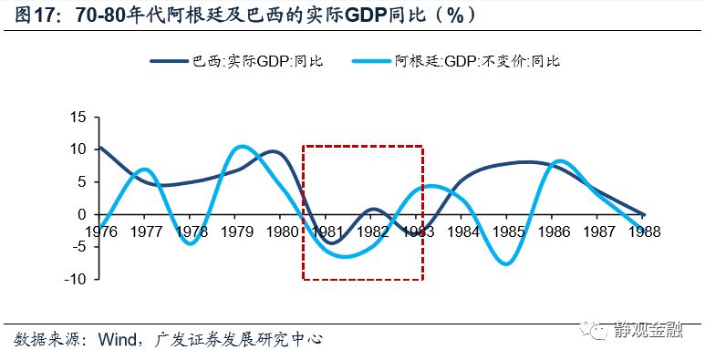 拉丁经济体在此过程中陷入了中等收入国家陷阱。1981年,阿根廷和巴西实际GDP同比滑落5.69%和4.25%,巴西的经济衰退持续到1984年,阿根廷的经济在1986年一轮短暂的复苏后再次滑落,直到90年代初才开始恢复趋稳。同一时期,拉美国家的债务问题也触发了严重的通货膨胀危机,阿根廷和巴西在80年代的通胀率很少低于100%,而且在80年代末和90年代初更出现了高达3000%的通胀率,极大地威胁了货币系统的稳定性,同时也进一步恶化了储蓄率不足、经济依赖外部融资的问题。
