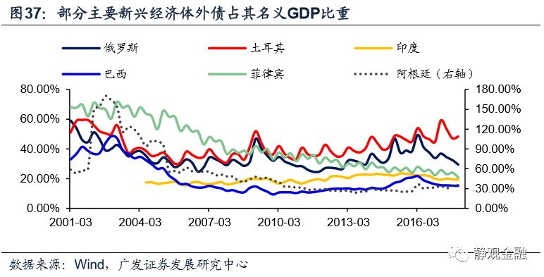 由图35可知,里拉大幅贬值以来(5月起),土耳其通胀中枢出现明显上移,表明滞胀风险上升。且该国外债占GDP比重及占外储比重均较高,且均在新兴经济体同类指标中位居前列。这表明若美元继续大幅升值、美国及土耳其贸易争端仍进一步发酵,土耳其出现经济及金融危机的风险非常之高。
