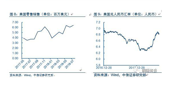 国际贸易争端不断,外部经济环境较为严峻。国际贸易方面,目前北美贸易谈判尚未完成,但已接近尾声,美国与墨西哥已就修订协议初步达成一致,但加拿大方尚未表态。《美墨贸易协定》收紧了墨西哥对美汽车出口规定并保持了农产品零关税贸易,但考虑到北美贸易达成一致作为“双赢”格局,对两国均是利好消息。虽然目前加拿大尚未表态,比索和加元对美元汇率上行已在一定程度上反映了人们对此持有乐观情绪。但是,中美贸易战自今年三月打响后,美国对中国贸易逆差有一定程度回升,但近来逆差不断扩大。其中,中国作为美国的第二大农产品出口国,中方对美国农业采取反制裁措施使得美国对中国的食品及活动物的出口金额甚至低于贸易战前,给美国的经济带来较大的下行压力。国际资本流动方面,今年三月以来,不断走软的美元指数给国际资本的流入带来一定压力。