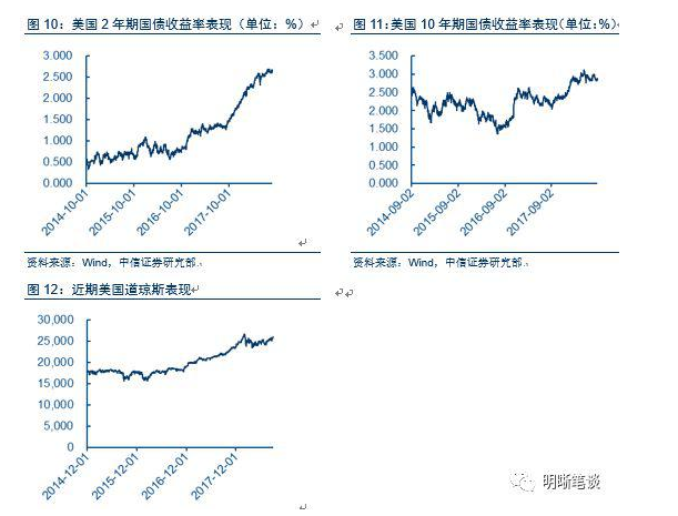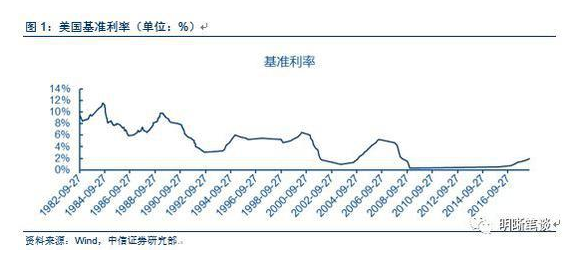 根据过去五次加息周期的经验来看,美国股市在结束新一轮加息周期后走熊风险不大。通胀方面,美国最近CPI有一定上行压力,7月份CPI同比上涨2.9%,与6月持平,为2012 年2月以来最大增幅。股市方面,道琼斯指数于2015年8月1日25666点开始上行,并呈持续走高态势。债市方面,长端10年期国债收益率于2015年2月2日1.68%开始抬起,短端2年期国债于2015年10月14日0.47%开始走高。就业方面,美国目前失业率处历史低水平。目前,美国经济呈稳定增长态势。2015年12月17日美联储开始本轮第一次加息,为2006年始长达十年的宽松货币政策画上句号。美联储曾在去年九月称,预计2018年将加息三次,2019年将加息两次。历史上最长加息周期为17个月,而近两次加息周期均在一年左右,所以我们预计,本轮加息周期将在2019年进入末期。