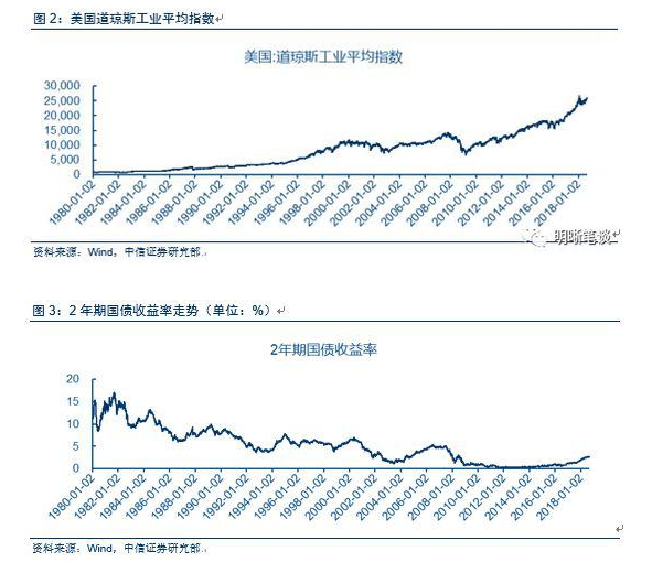 第一轮加息周期前,宽松的财政政策拉开美国经济复苏序幕,牛市引起通胀急速上行。1980年美国经济处于复苏初期,困扰美国长达十年的滞胀临近尾声,里根政府主张减税帮助经济复苏。但至1981年美国的通胀率已达13.5%,远超合理范围。债市方面,十年期国债在1980年6月16日录得年内最低收益率9.47%后开始上行,至1981年10月录得66.3%的增长,两年期国债收益率在10%小幅震荡;股市方面,1982年8月美国股市开始腾起,至加息周期开始,道琼斯(25964.8203, -22.10, -0.09%)指数录得39%的增长。为抑制通胀,里根政府采取稳定的货币政策进行控制,从1983年3月开启第一轮加息周期,通胀率从1981年的超过13%降至1983年的4%以下。本轮加息周期起始时1983年3月,股市和债市均处于牛市腾起阶段,债市对经济形势的反应敏感度要前于股市,至本轮加息周期止1984年8月,股市和债市均未有较大回落,仍高于加息前水平。本轮周期历时17月的加息周期提高基准利率3个百分点。