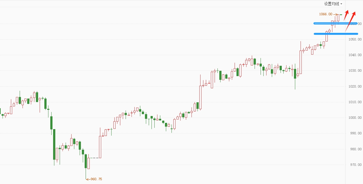 国际黄金日线收光头阳线,并创新高,涨势加速,短期多空分界点移至4850(1082)继续看涨。黄金压力: 4890(1098),支撑:4850,4825,(1082,1075)。