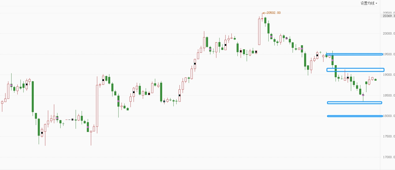 白银TD分时出现V型形态,但分时、日线下跌结构完好,无法判断回调结束,仍处于震荡下行当中,关注18000关口支撑。白银压力:76.70,77.80(19150,19500),支撑:74.00,72.50(18300,18000)。